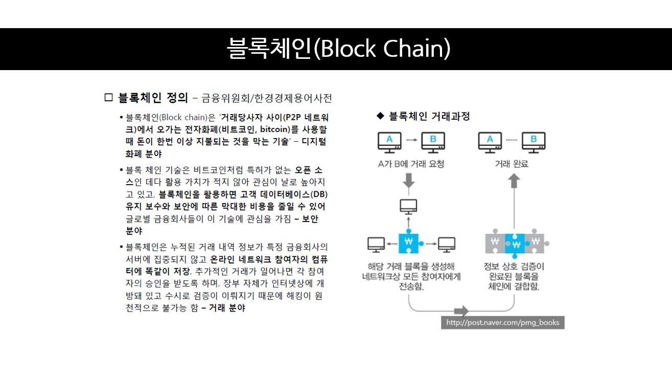 블록체인의 정의는 분야에 따라 다양합니다. ‘디지털 화폐분야’에서는 거래당사자 사이(P2P 네트워크)에서 오가는 전자화폐(비트코인, bitcoin)를 사용할 때 돈이 한번 이상 지불되는 것을 막는 기술입니다. ‘보안 분야’에서는 블록 체인 기술은 비트코인처럼 특허가 없는 오픈 소스인 데다 활용 가치가 적지 않아 관심이 날로 높아지고 있고, 블록체인을 활용하면 고객 데이터베이스(DB) 유지 보수와 보안에 따른 막대한 비용을 줄일 수 있어 글로벌 금융회사들이 이 기술에 관심을 가지고 있습니다. ‘거래 분야’에서 블록체인은 누적된 거래 내역 정보가 특정 금융회사의 서버에 집중되지 않고 온라인 네트워크 참여자의 컴퓨터에 똑같이 저장, 추가적인 거래가 일어나면 각 참여자의 승인을 받도록 하며, 장부 자체가 인터넷상에 개방돼 있고 수시로 검증이 이뤄지기 때문에 해킹이 원천적으로 불가능 합니다.