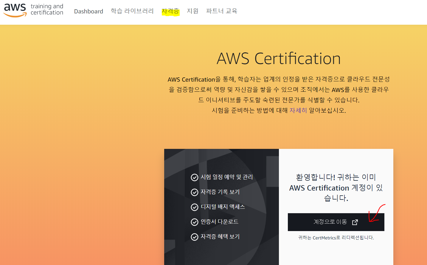 3. 로그인 후 "자격증" 클릭하면 '환영합니다! 귀하는 이미 AWS Certification 계정이 있습니다.' 아래에 있는 "계정으로 이동" 클릭