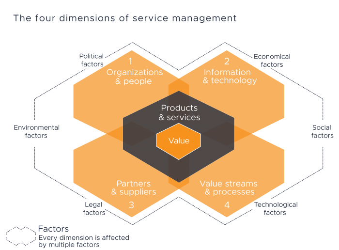 서비스 관리의 4차원 모델 - 조직과 사람(Organization and People) - 가치 흐름과 프로세스 (Value Streams and Processes) - 파트너와 공급자(Partners and Suppliers) - 정보와 기술 (Information and Technology) |