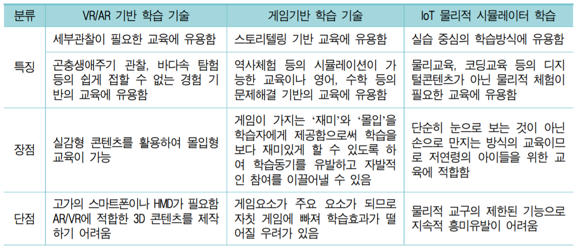 - 교육분야에 VR, AR, AI와 같은 신기술을 접목하여 학습자 맞춤 교육을 제공하고 교사 업무 경감을 통하여