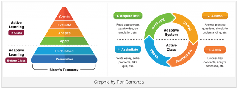 미국 애리조나주립대학에서는 수업 전에는 온라인 강의 등을 통해 기억하고, 이해하는 수준까지 학습을 진행하여 개인 적응형 학습이 가능하도록 하였고, 수업 중에는 액티브 러닝으로 진행하였습니다. 이때에 더 상위 단계의 학습으로 나아갈 수 있습니다. 적용하고, 분석하고, 평가하고, 창조적 사고까지 가능하게 되어 학습 효과를 입증하였습니다.