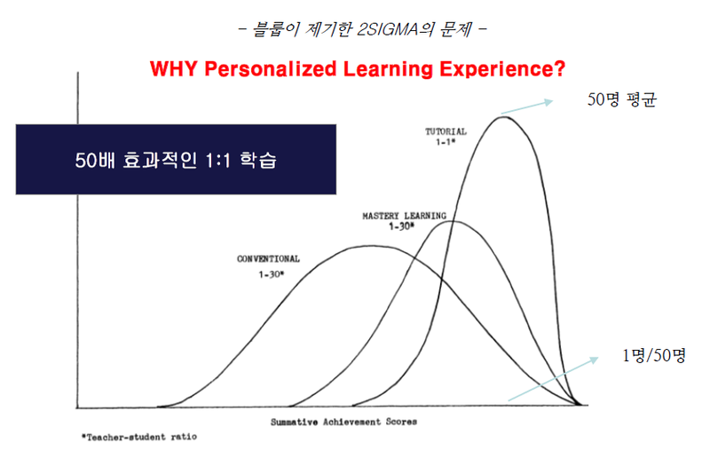 실제 많은 분들이 공공연하게 알고 있는 사실은 바로 일대일 학습의 효과입니다. 전통적 집합교육보다 개인 교습의 학습효과가 더 크다는 사실은 다들 인지하고 계실 겁니다. 실제로 개인 교습을 받은 학생의 평균 수준은 전통적인 방식으로 수업을 받은 학생의 상위 2% 수준과 같다고 합니다. 즉, 1:1 학습의 효과가 강의식학습보다 훨씬 효과적입니다.