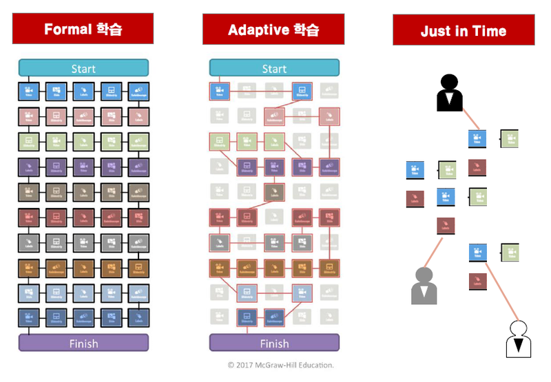 하지만 4차 산업혁명 시대가 도래하며, 디지털트렌스포메이션이 이루어지고, 개개인의 역량과 수준에 따라 맞춤형 학습이 중요해졌습니다. 동일한 지식이 아니라 개인에게 적합한 작은 단위의 학습이 요구되면서 마이크로러닝이 더 강조되고 있습니다. 작은 학습 콘텐츠가 존재해야 더 세분화되어 개인맞춤형학습이 가능해 지는 것입니다. 개인 맞춤형 학습이 가능한 것이 바로 어댑티브러닝인 것입니다.