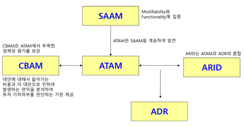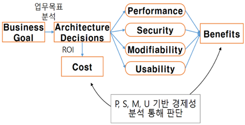 - Cost Benefit Analysis Method - SAAM, ATAM의 기술적 아키텍처 및 경제성 평가까지 하여 수익이 최대가 될 수 있도록 의사결정을 도와주는 SW아키텍처 평가모델 |